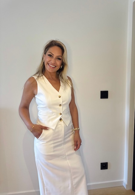 Witte two piece set dat bestaat uit een midi rok en gilet