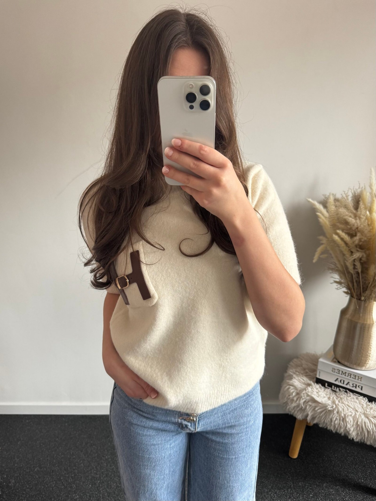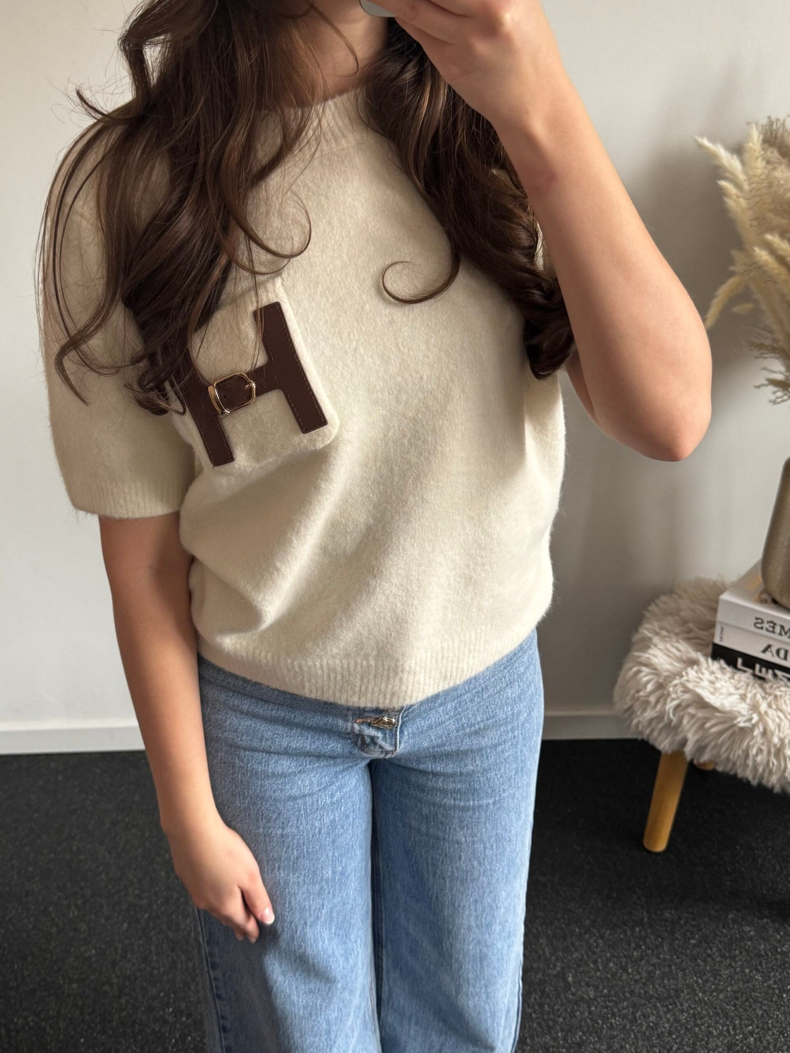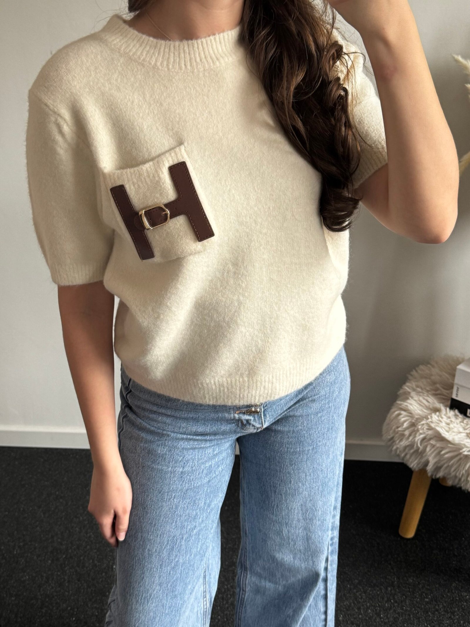 Zacht gebreide top met korte mouwen en luxe H-detail op de borst.